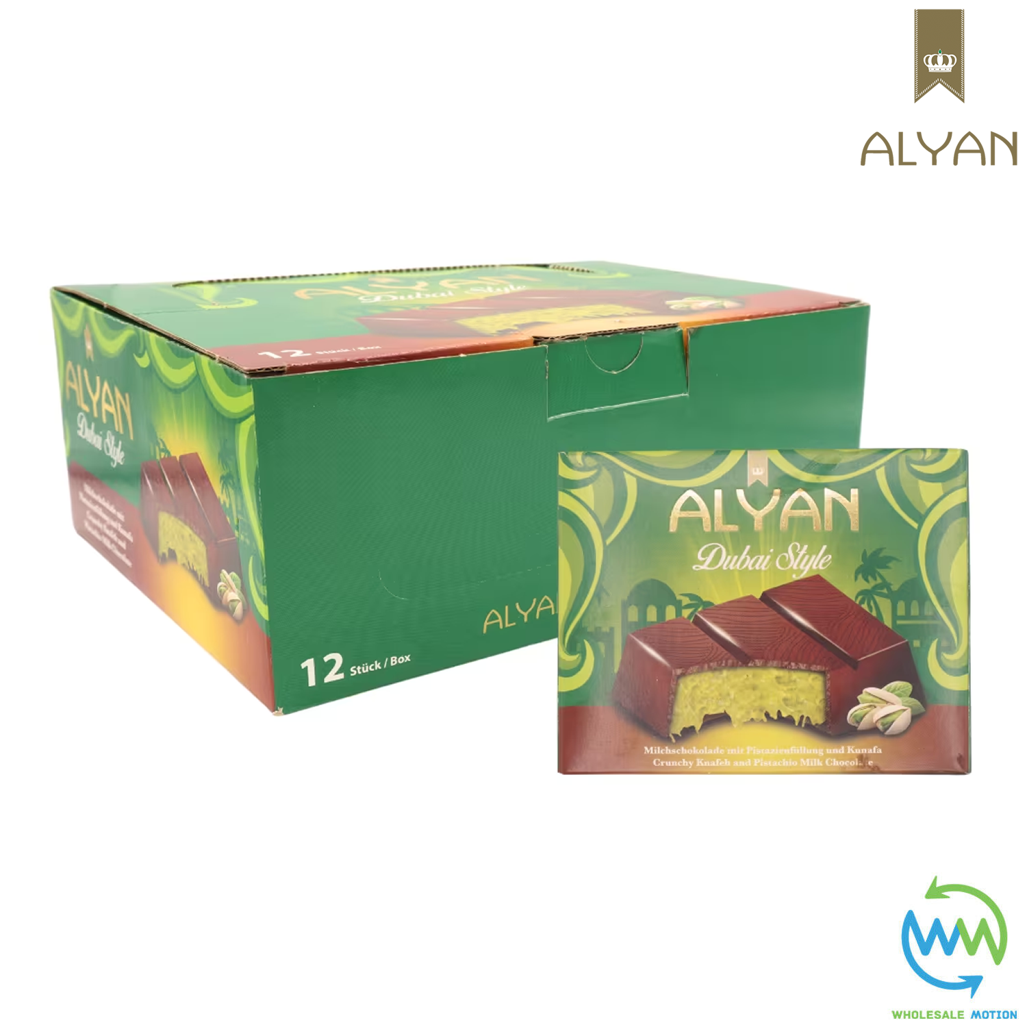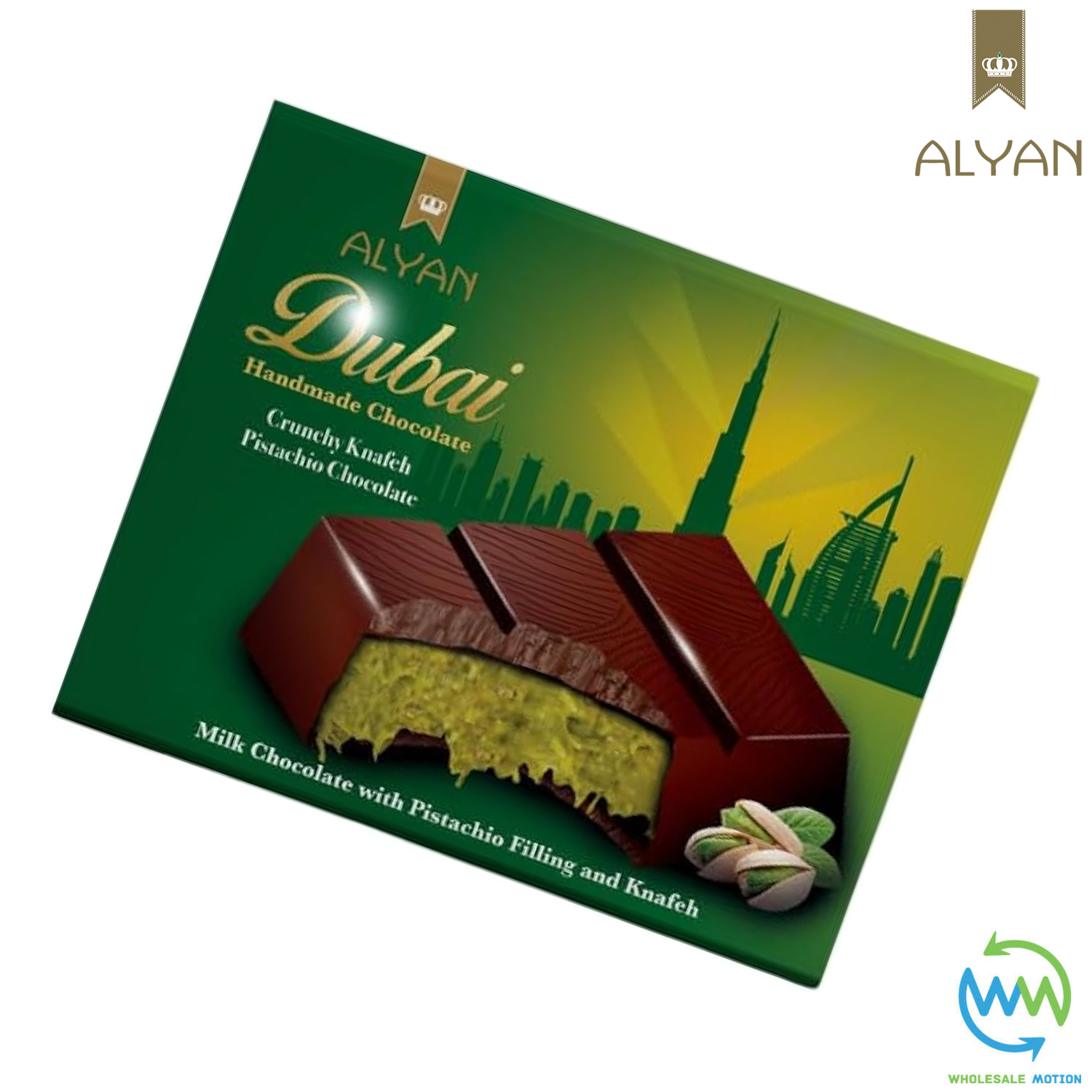 These Premium Quality Original Alyan Dubai Chocolate Bar are perfect for snacks, childrens treats, parties, events etc! With their delicious pistachio creamy filling with a crispy texture they are a must have for every chocolatelover! Available in bars of 1, 2, 3, 4, 5, 6 & 12 Dubai Chocolate Bars from the drop down menu above. Take advantage of our low prices today!