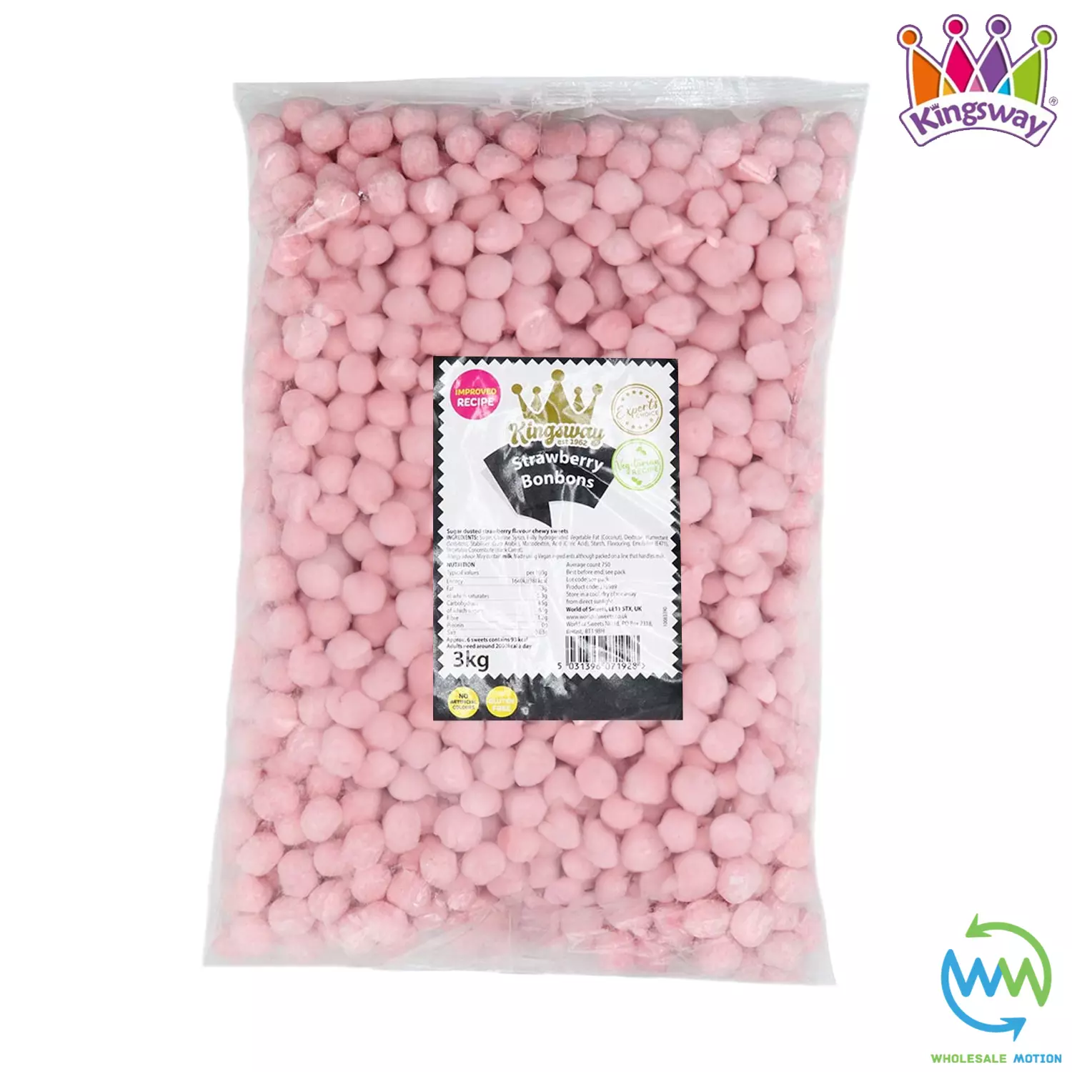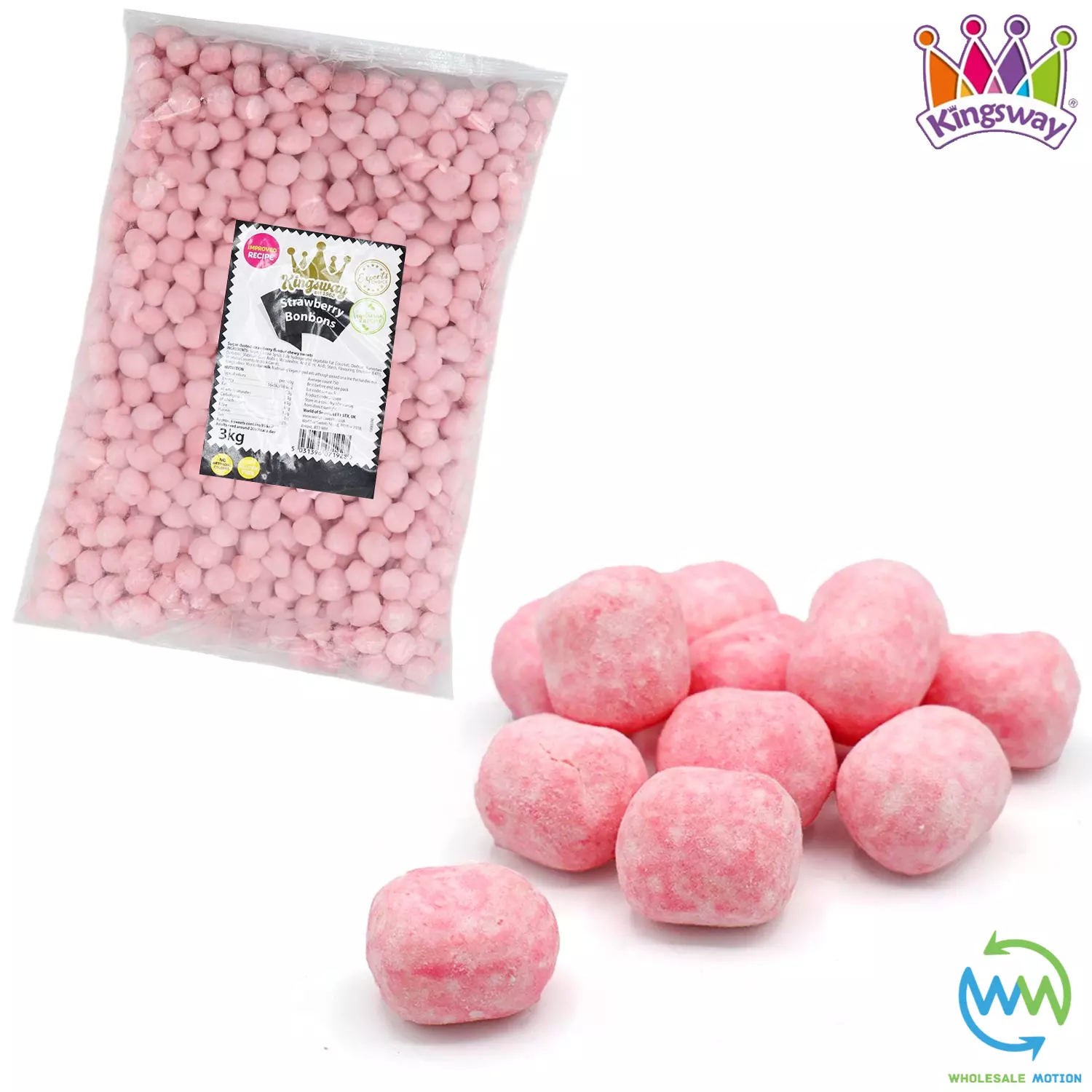 These Premium Quality Original Kingsway Veggie Strawberry Bon Bons are perfect for snacks, childrens treats, parties or events etc! With their Classical Sphere shape and delicious Strawberry flavour accompanied with Sugar Dusting they are a must have for any sweet lover! Available in weights of 1, 100g, 250g, 500g, 750g 1kg, 1.5kg, 2kg, 2.5kg & 3kg Strawberry Bon Bons from the drop down menu above. Take advantage of our low prices today!