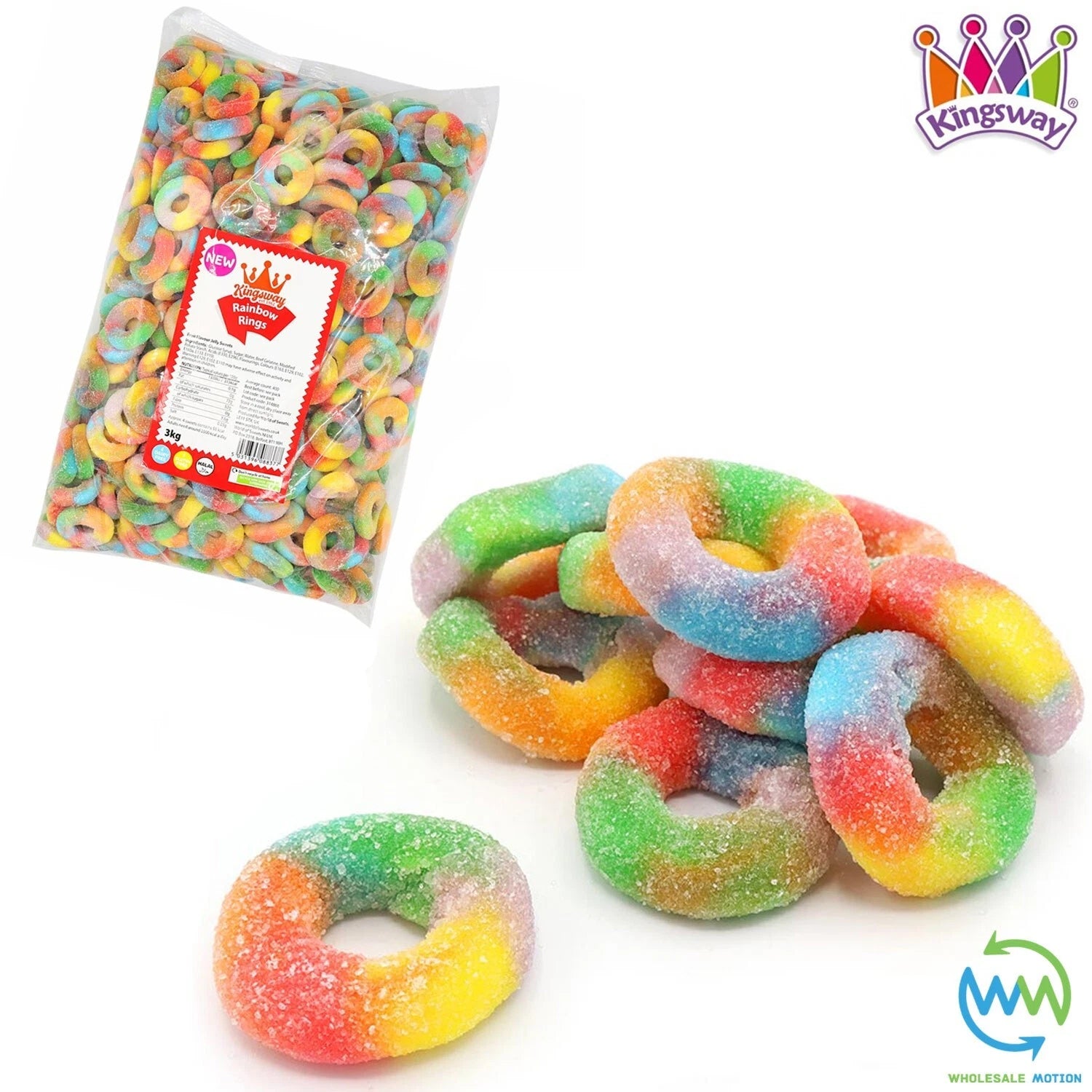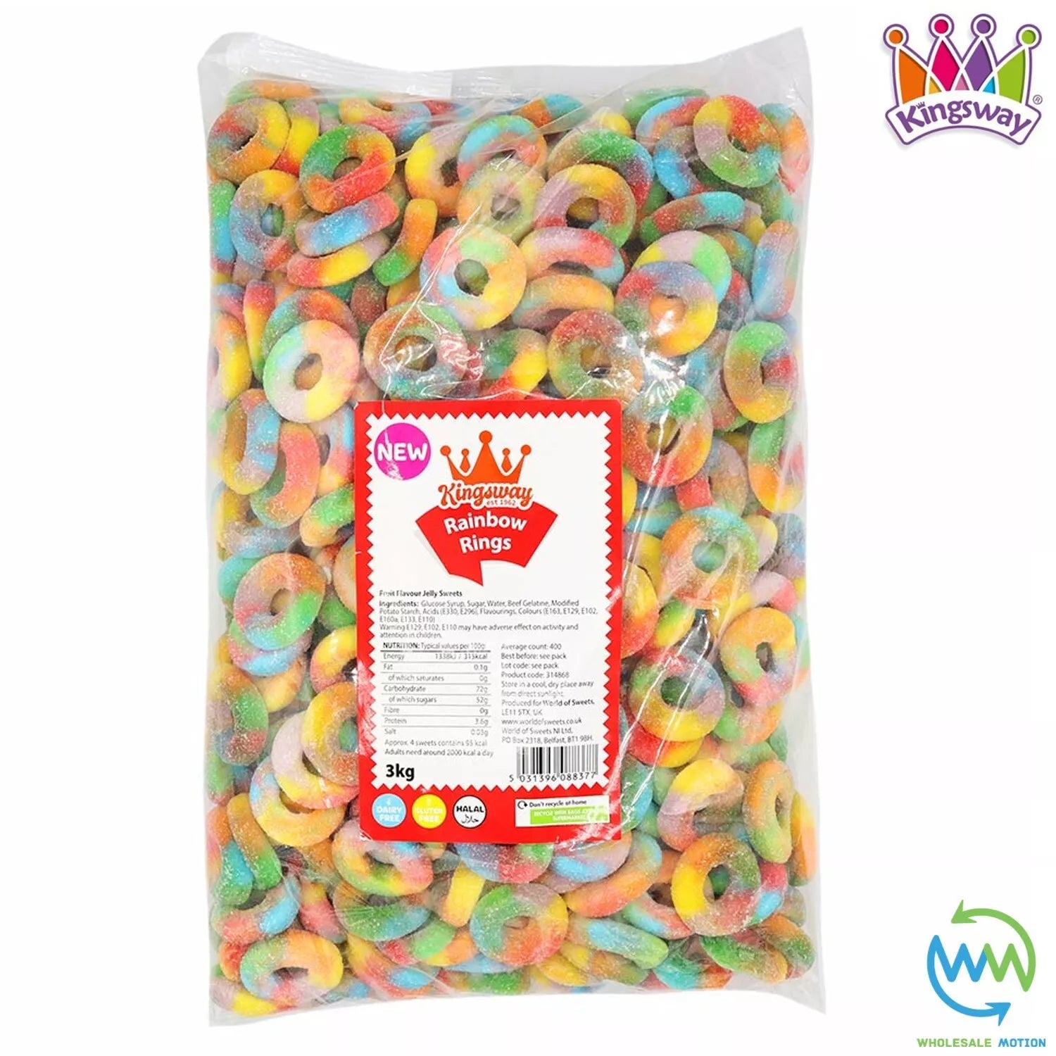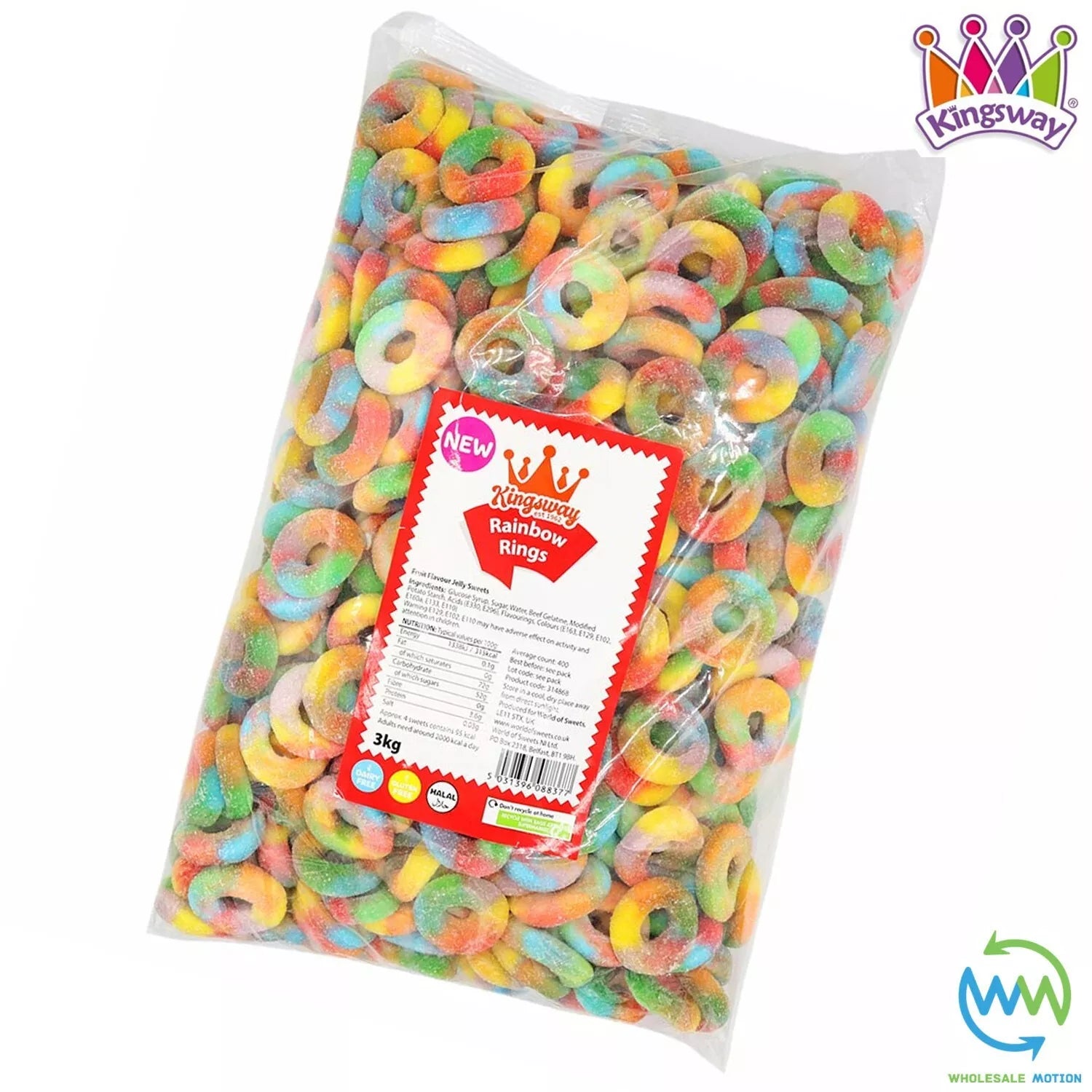These Premium Quality Original Kingsway Rainbow Ring Sweets are perfect for gifts, snacks, parties or events etc! With their fun rainbow ring designs and delicious fruit tastes they are a must have for any sweet lover! Available in weights of 1, 100g, 250g, 500g, 750g, 1kg, 1.5kg, 2kg, 2.5kg & 3kg Rainbow Rings sweets from the drop down menu above. Take advantage of our low prices today!