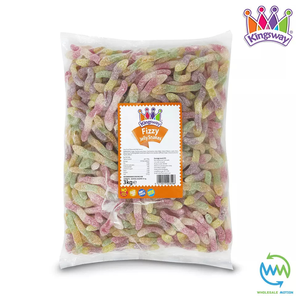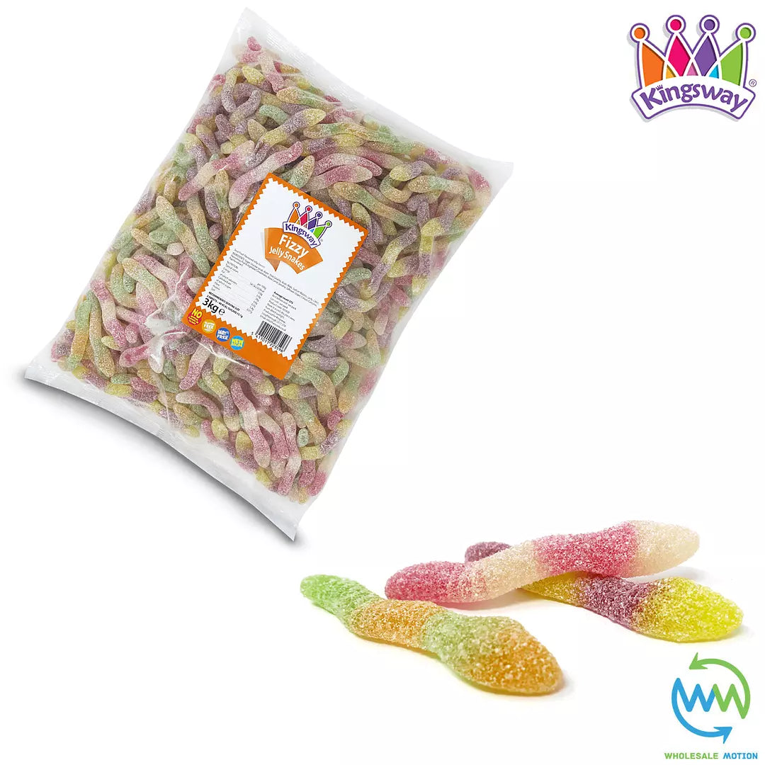 These Premium Quality Kingsway Fizzy Jelly Snakes are perfect for snacks, childrens treats, parties or events etc! With their novelty snake designs & delicious sour fruity flavours and they are a must have for every sweet lover! Available in weights of 1, 100g, 250g, 500g, 750g, 1kg, 1.5kg, 2kg, 2.5kg & 3kg Fizzy Jelly Snakes from the drop down menu above. Take advantage of our low prices today!