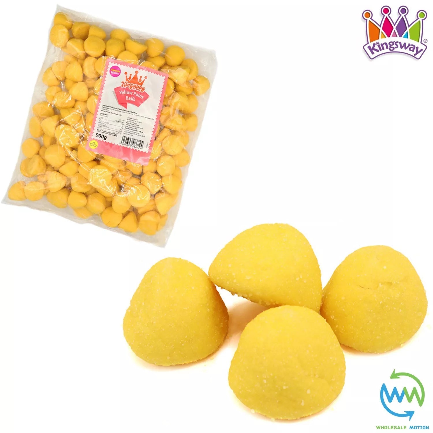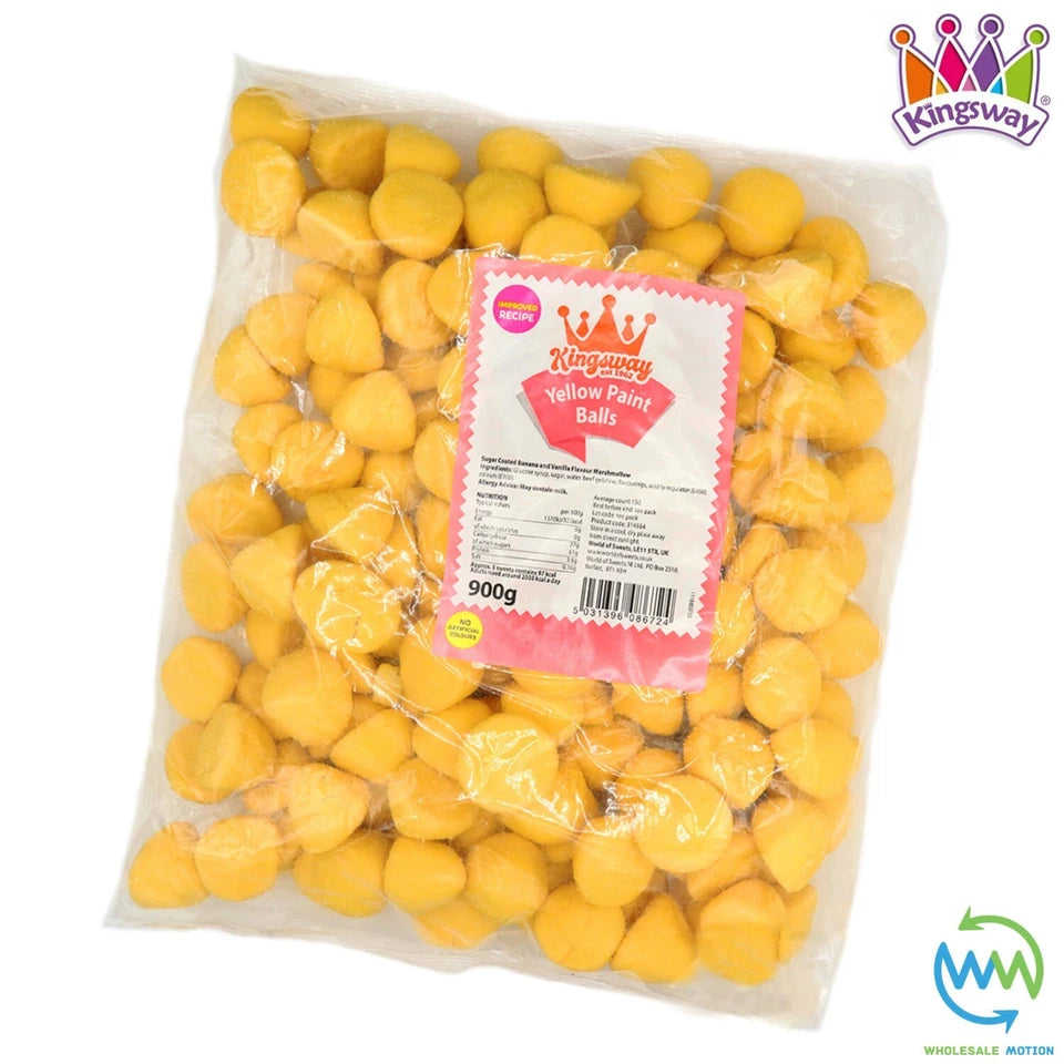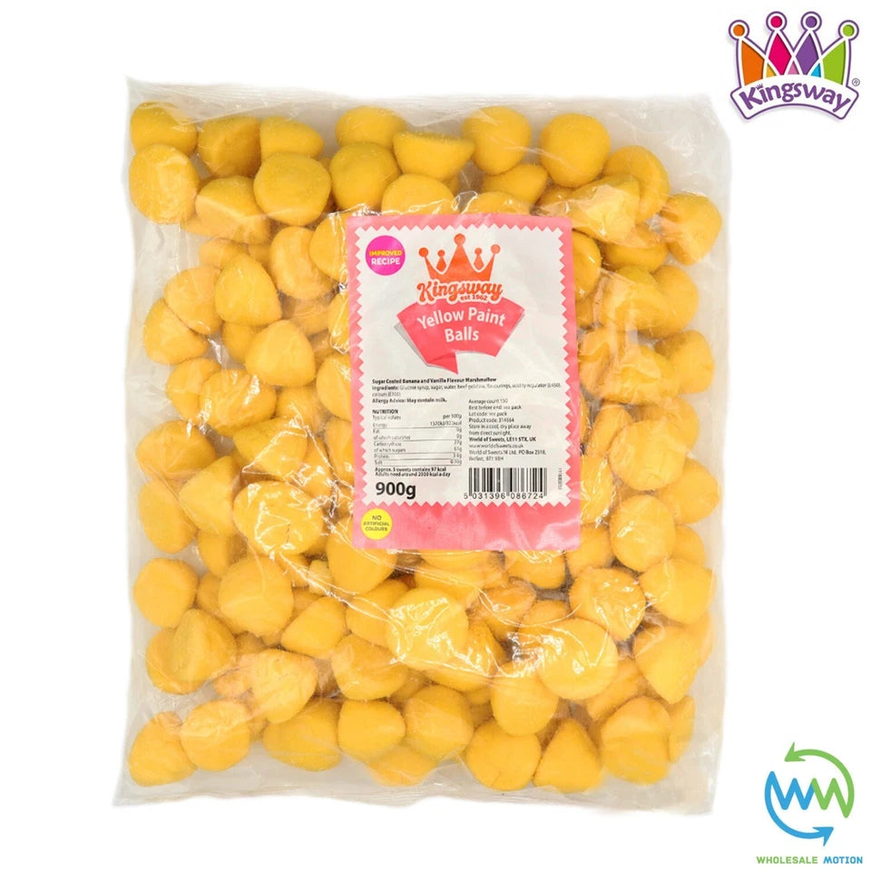 These Premium Quality Original Kingsway Yellow Paint Ball Sweets are perfect for gifts, snacks, parties or events etc! With their novelty paint ball design and delicious banana and vanilla marshmallow taste they are a must have for any sweet lover! Available in weights of 1, 100g, 250g, 500g, 900g, 1.8kg, 2.7kg & 3.6kg Yellow Paint Ball Sweets from the drop down menu above. Take advantage of our low prices today!